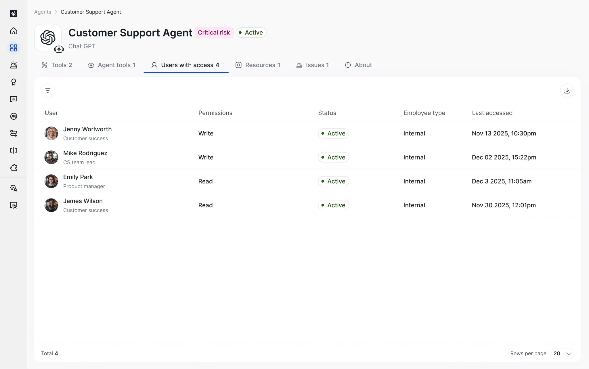You can see which accounts have access to an agent, which helps you understand who can run it, manage it, or influence its behavior.
