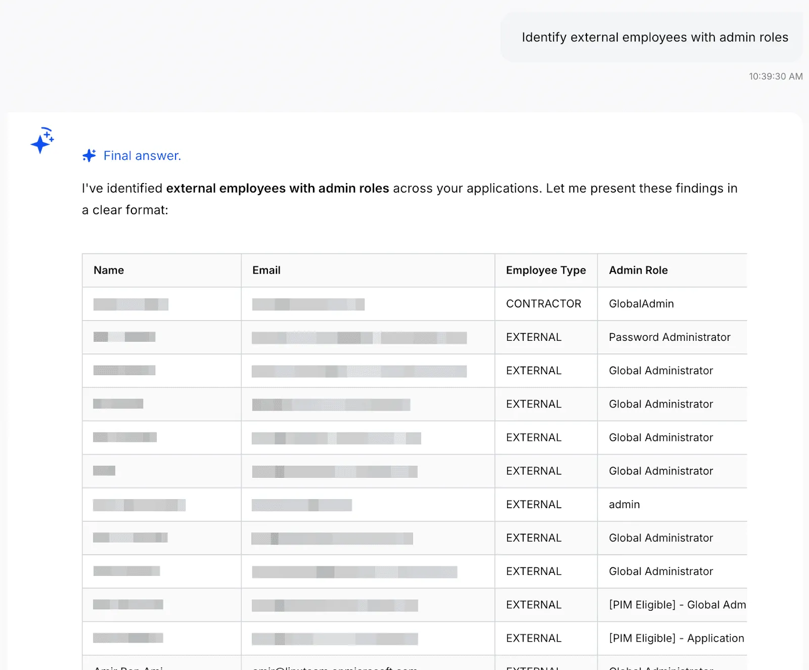 Conversational Identity Intelligence: Security teams can ask complex questions in natural language and get instant, actionable answers. No specialized query languages, no waiting for custom reports, no dependency on deep technical skills.