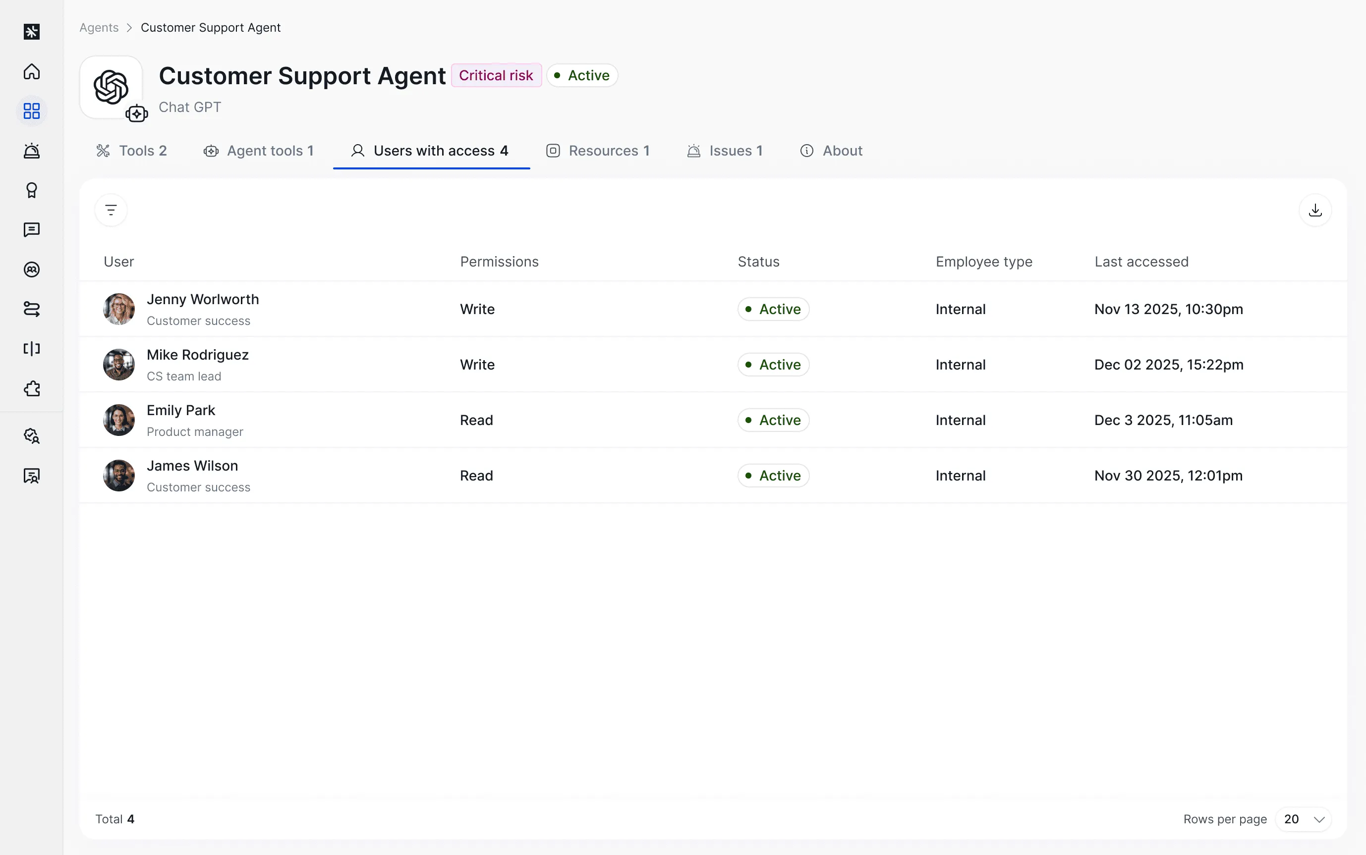 You can review the permissions and resources the agent can reach, including signals that help you prioritize what to look at first.
