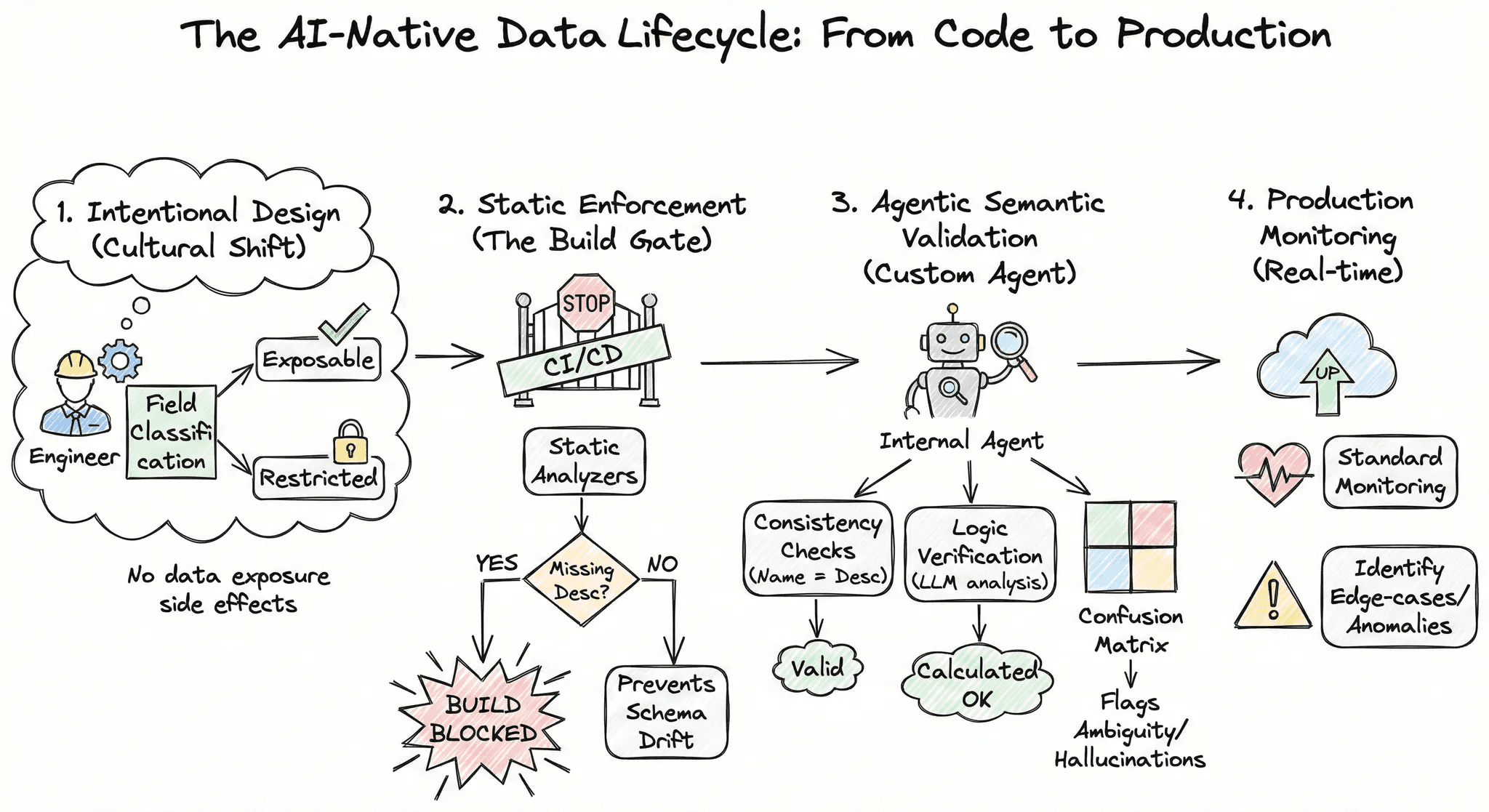 Drift Detection: Implement automated "Semantic Tests" in your CI/CD. If a new field is added without a description or violates naming conventions, the build fails. AI-readiness is a first-class citizen.